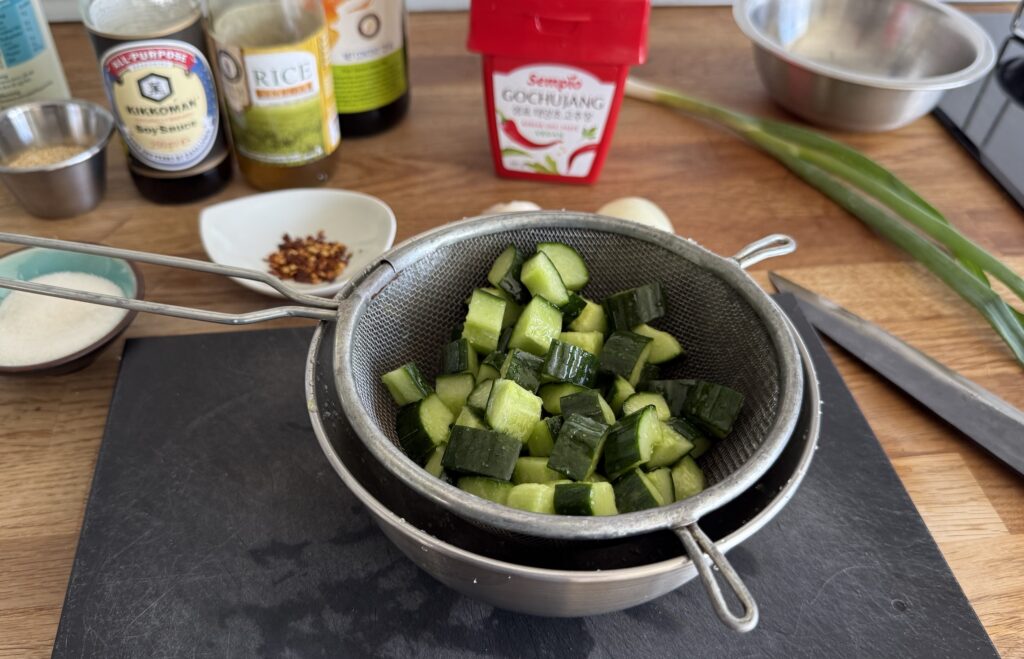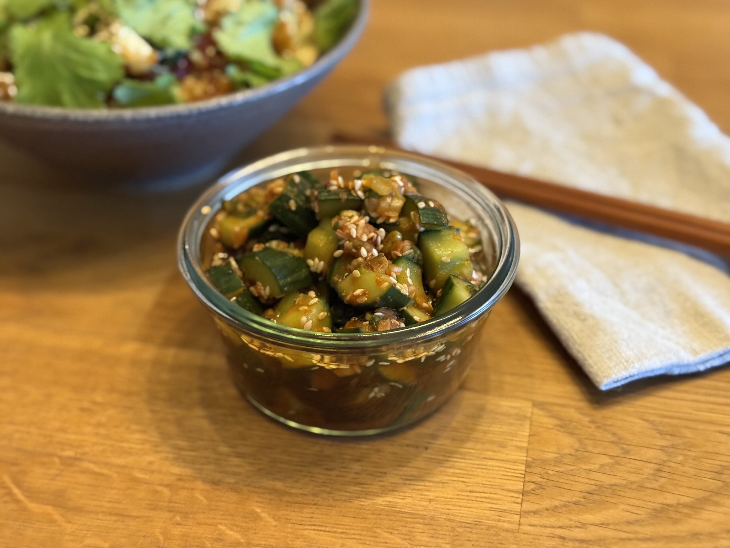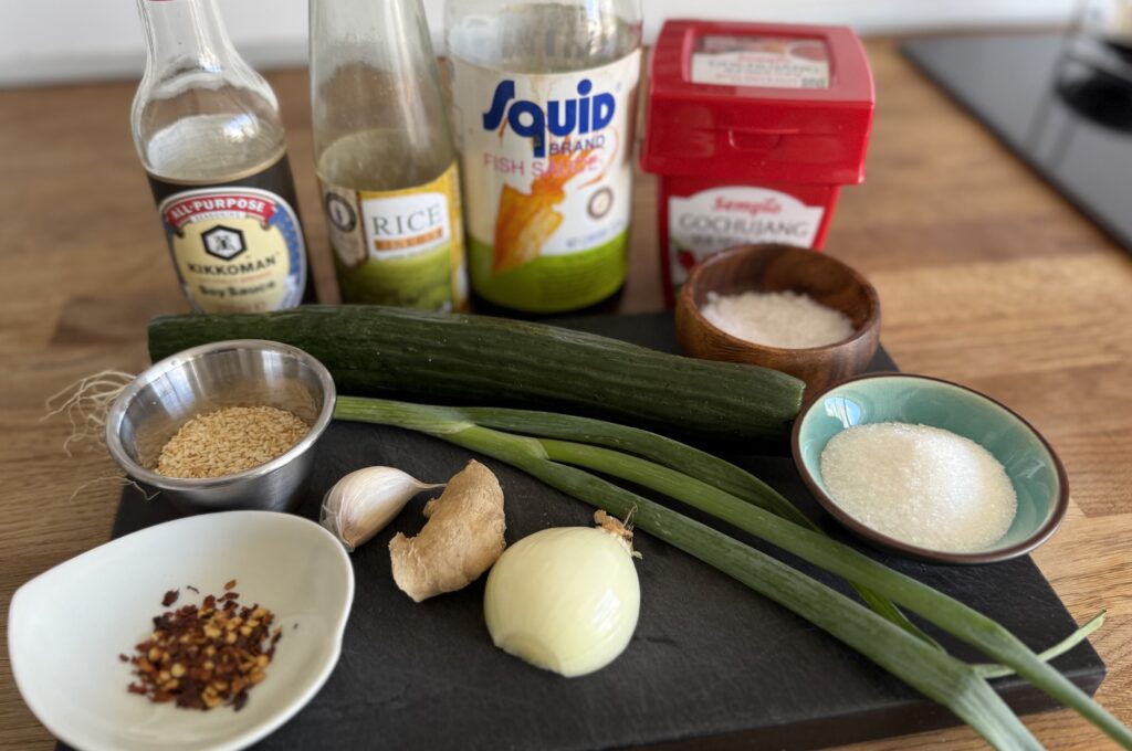 Lækker lyn-fermenteret agurkesalat fra det koreanske køkken. God som tilbød til grillet mad.