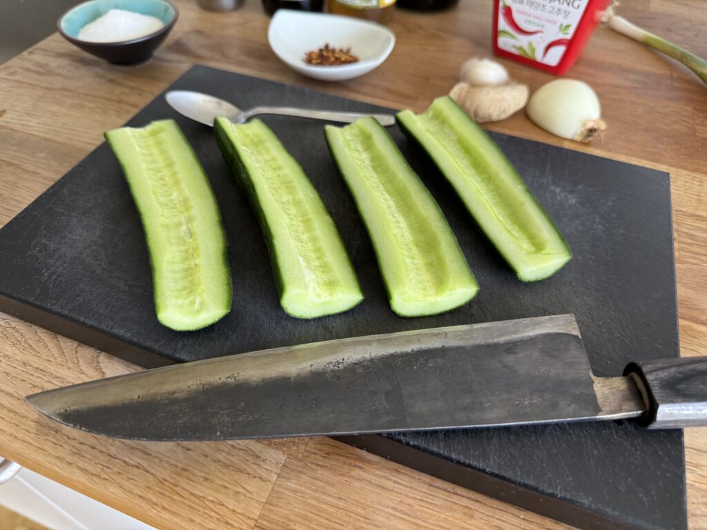 Vælg tynde agurker eller skole-agurker så der ikke er for mange kerner i og kimchi’en bliver for våd.. Hvis der er mange kerner i, man man med fordel skrabe dem ud med en teske når agurken er halveret.