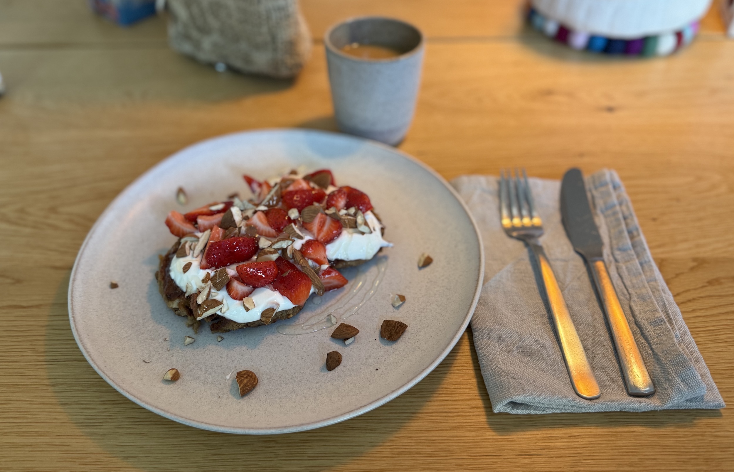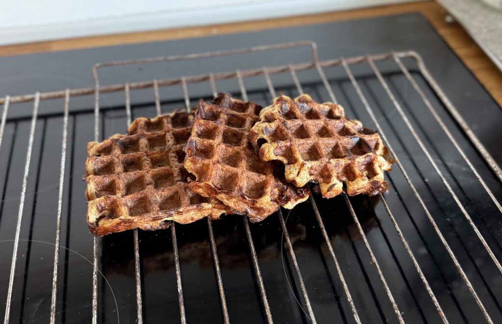 Vaflerne bliver ikke så sprøde (jeg gav dem som almindelige Belgiske vafler i mit vaffeljern), men de bliver super-fluffy og det er markant nemmere at stå med end på panden, og man kan skære frugten imens de bager. Jeg fik 5 vafler ud af en portion.